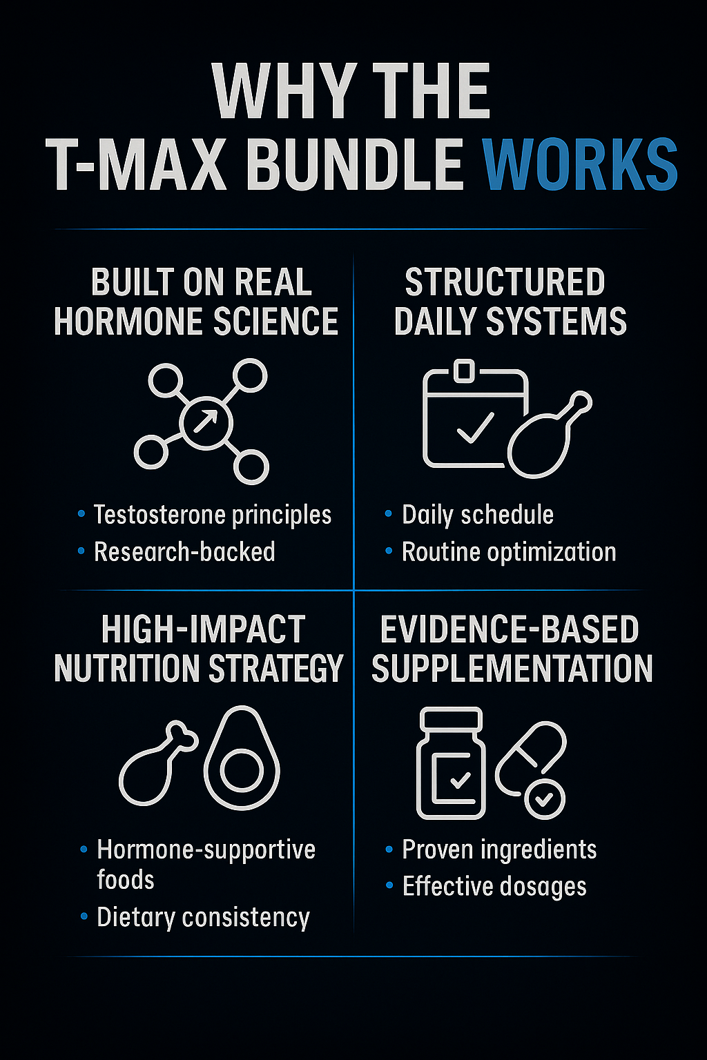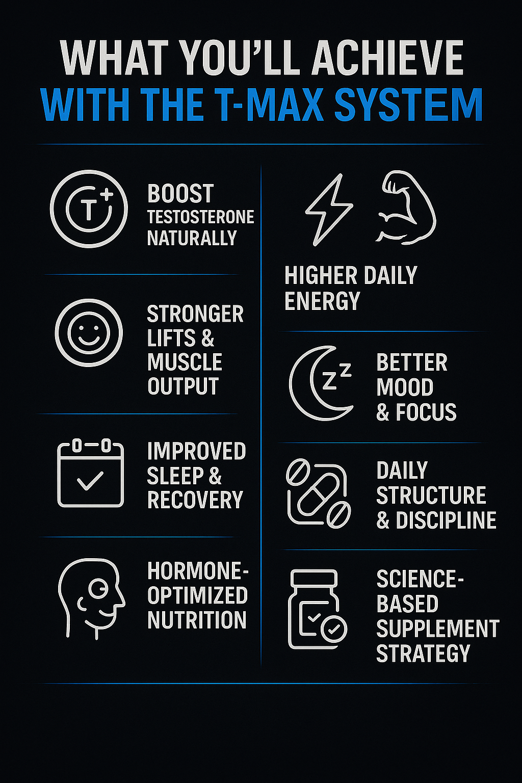 - The T-Max Diet: 75+ high-testosterone foods with complete meal plans, grocery lists, recipes, and 4-week eating strategy